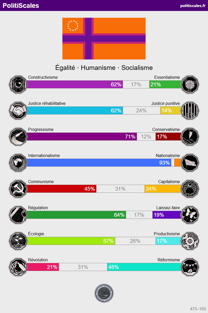Politiscales is an online political positioning test. It is designed to be a more complete version on 8values, with 8 different axes.