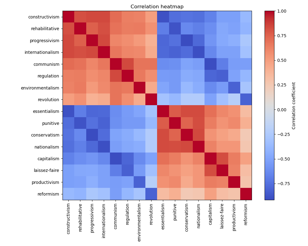 The correlation heatmap shows strong correlation of all political axes.