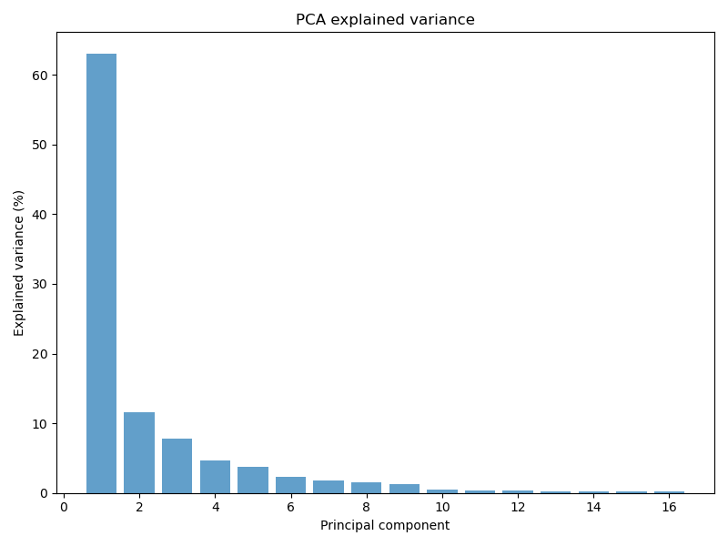 About 2/3 of the variance is explained by PC1, and 90% of the variance is explained by 5 components. This shows that the 16-variables model is highly redundant, as most variation in responses lies in a space of 2 to 5 dimensions.